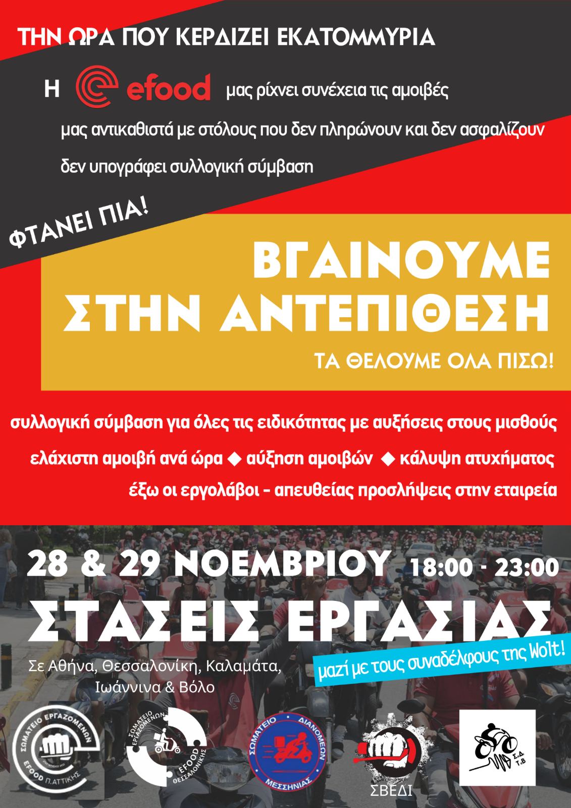 Γι αυτό και παίρνουν πάλι το δρόμο του αγώνα με στάσεις εργασίας την Παρασκευή 28/11 και Σάββατο 29/11 από τις 18:00 έως τις 23:00 στην efood και στην Wolt με συμμετοχή από Αττική, Θεσσαλονίκη, Ιωάννινα, Καλαμάτα, Βόλο, Κατερίνη! Η συγκέντρωση στην Αθήνα θα γίνει και τις δύο ημέρες στις 18:30 στα KFC Αλεξάνδρας & Κηφισίας και θα ακολουθήσει μοτοπορεία.