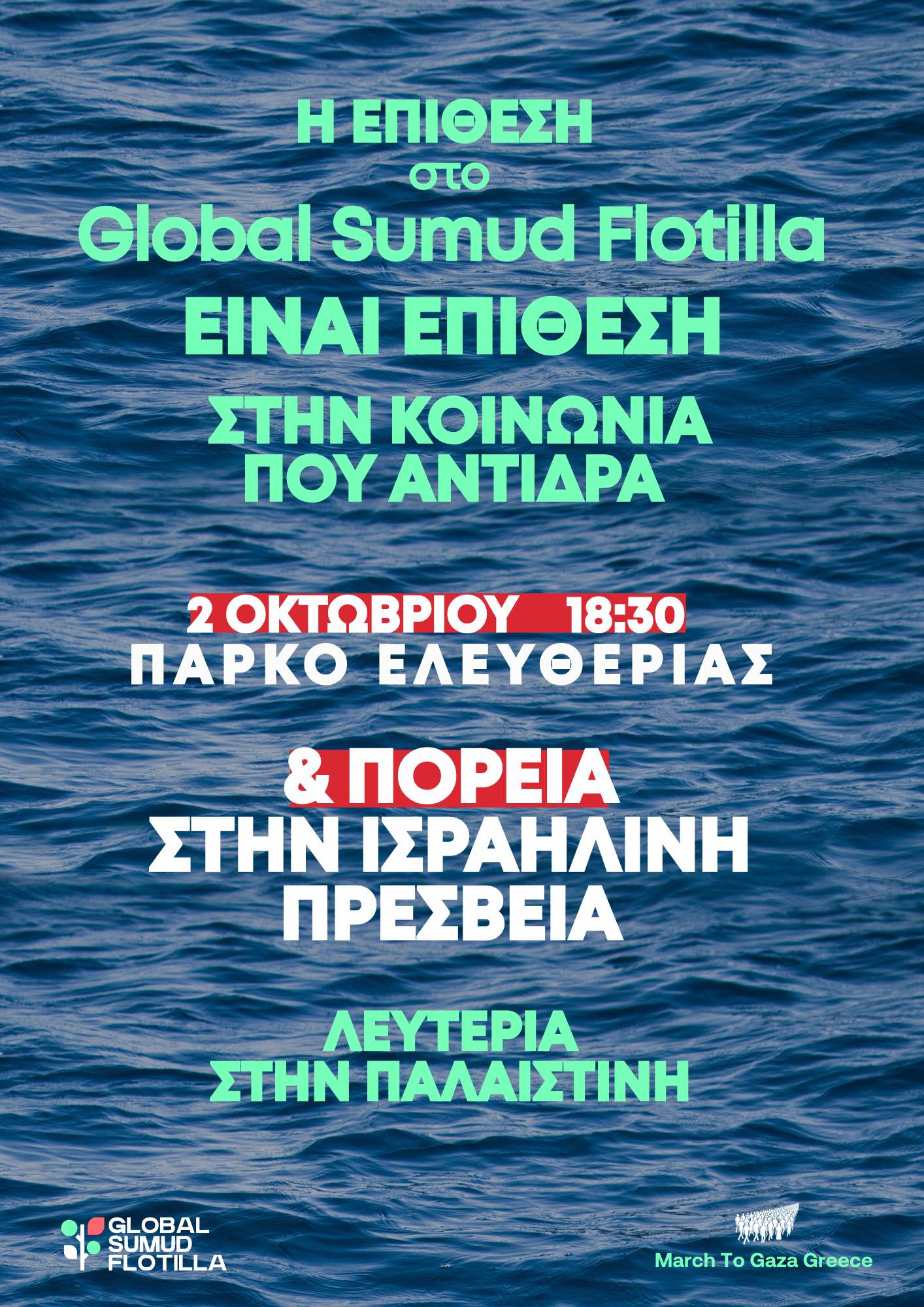 Καλούμε σε όλες τις κινητοποιήσεις καταδίκης του Ισραήλ και αλληλεγγύης στο διεθνή στόλο Sumud.