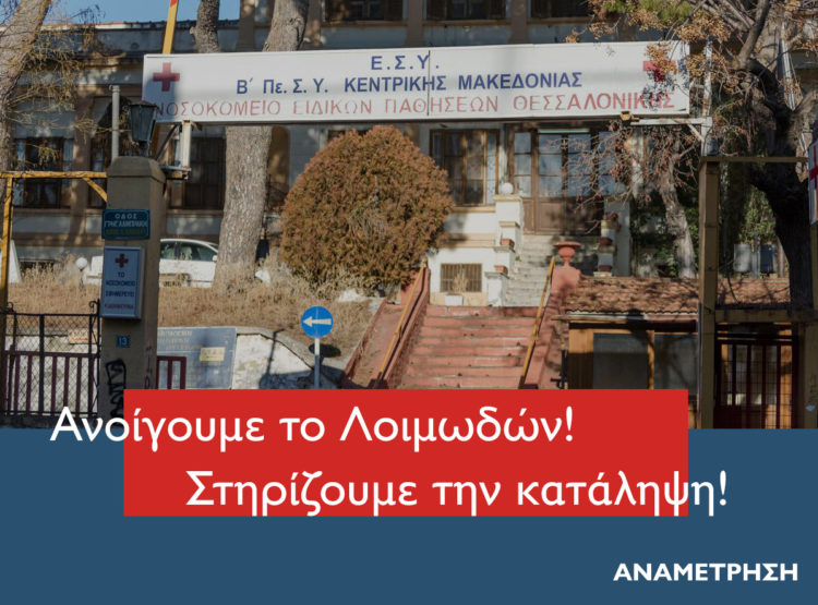 Σήμερα Τετάρτη 6/4 αμέσως μετά την δυναμική απεργιακή συγκέντρωση στην Θεσσαλονίκη, το Κοινωνικό Ιατρείο Θεσσαλονίκης από κοινού με πολίτες και συλλογικότητες της πόλης άνοιξε το εγκαταλελειμμένο νοσοκομείο Λοιμωδών στην Γ.Λαμπράκη. Σκοπός της κατάληψης είναι να απαιτήσει την άμεση επαναλειτουργία του.